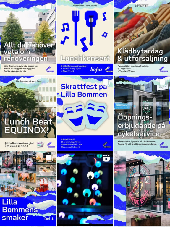 Läppstiftets härliga innergård fortsätter att leverera aktiviteter för såväl hyresgäster som besökare. Här sker lunchkonserter, skrattfester, klädbytardagar, träningsevent och mycket mer. Inom kort blir det också en härlig Mocktail AW med färgglada alkholfria drinkar, musik, pingis och go vibe. Håll utkik på Lilla Bommens instagram för att hålla dig uppdaterad. Den som följer får se: