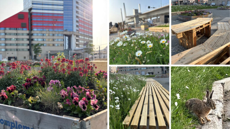 Mellan bygget av Kaj 16 och Läppstiftet växer nya tillfälliga planteringar och sittytor fram. Syftet är att ta tillvara på spillvirke från byggnationerna, att skapa en trevlig miljö under byggtiden samtidigt som vi bidrar till den biologiska mångfalden i området. I takt med att fler byggnationer startar kan planteringarna komma att flyttas och nya kommer till. Just nu blommar det för fullt och både små insekter och lite större djur verkar trivas bra. Varmt välkommen du med!